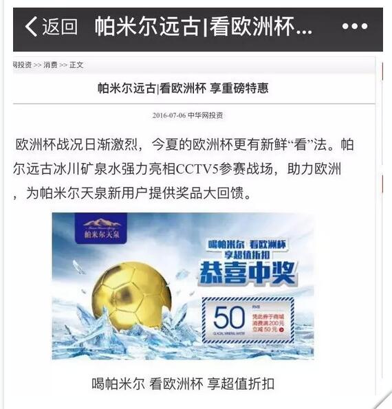 2016年欧洲杯球赛直播期间,观众通过扫描CCTV界面二维码参加抽奖,集齐3枚帕米尔天泉logo联动标志,就能获得50元现金折扣。本次活动开放式规则力邀全国球迷参与,火热进行,一上线就引起了广大消费者的热烈关注,上线当天就有近万名观众参与活动,并有3000位观众获得了优惠包,“边狂欢边领奖”的形式受到了用户极大好评,帕米尔天泉表示继续支持欧洲杯助力活动。