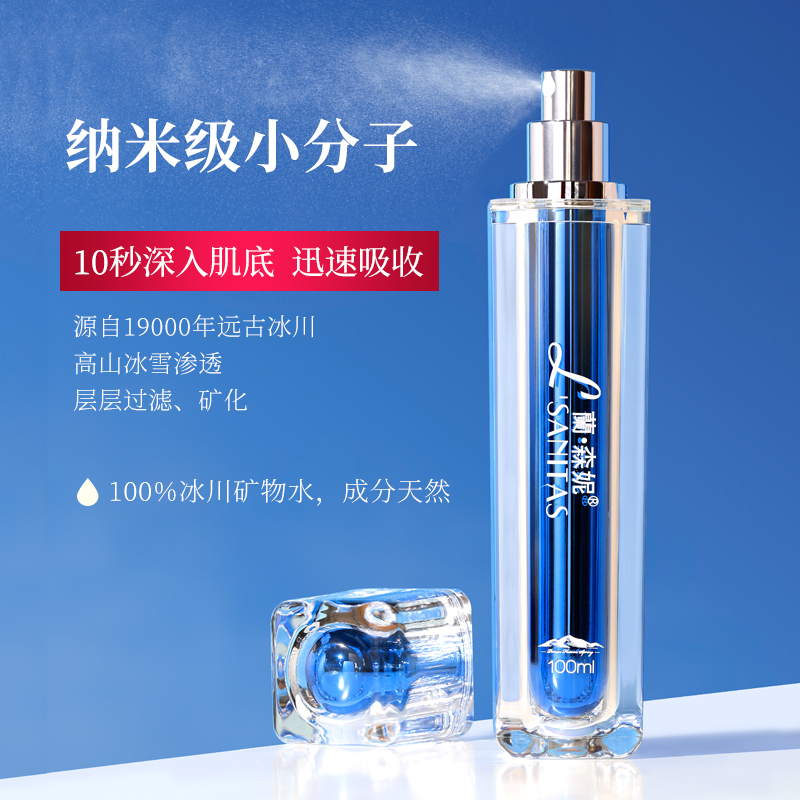 以天然冰川矿泉水为原液,汲自海拔7509米冰川水源地,无菌罐装。丝般轻盈水漾纯净。特有天然小分子团及丰富矿物质。细密喷雾为肌肤形成可呼吸的呵护膜。为肌肤全天锁水保湿,滋润新生。